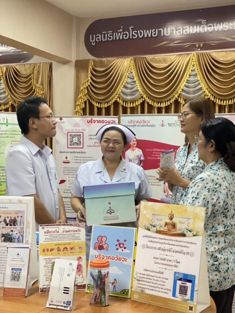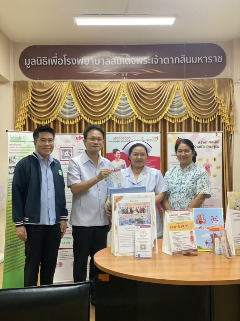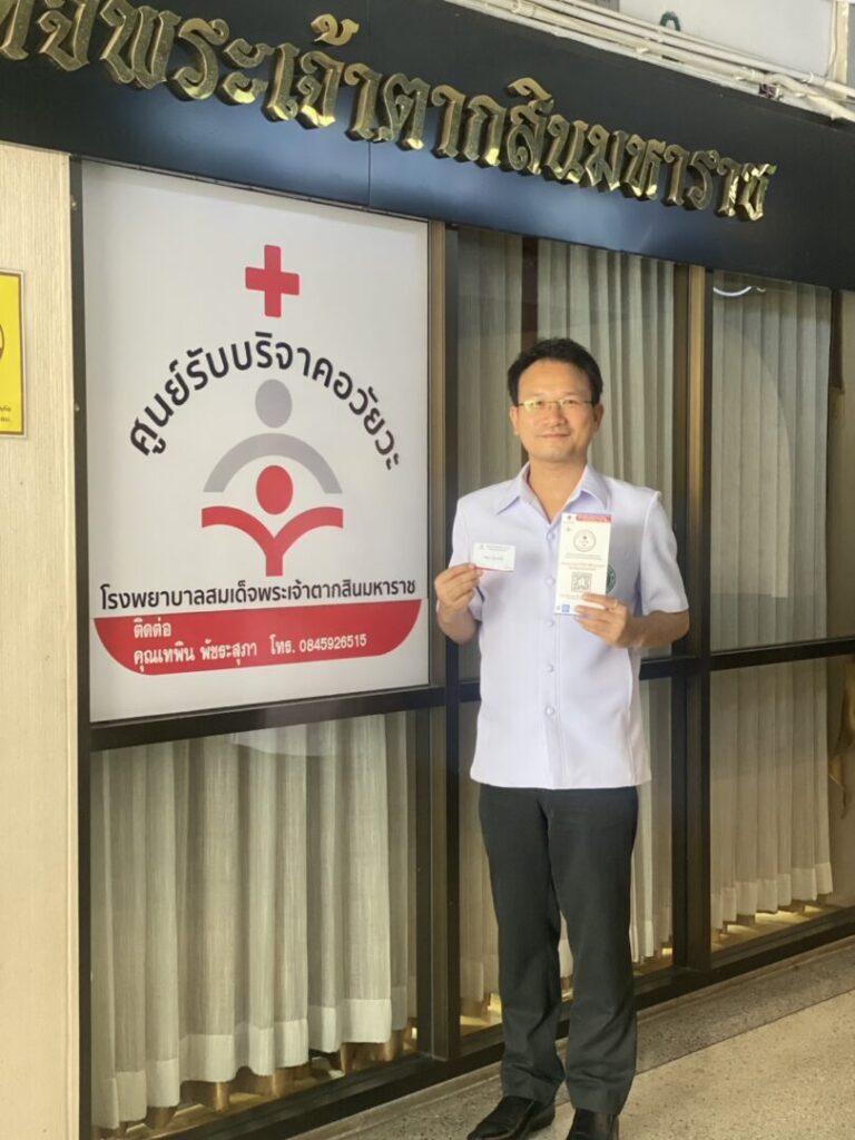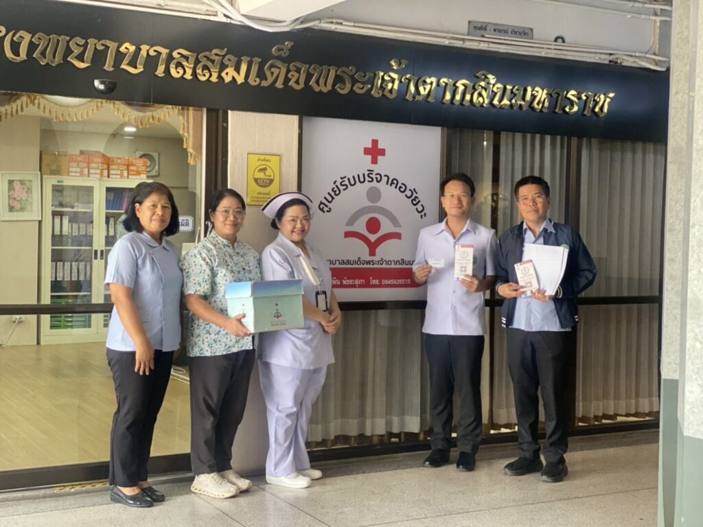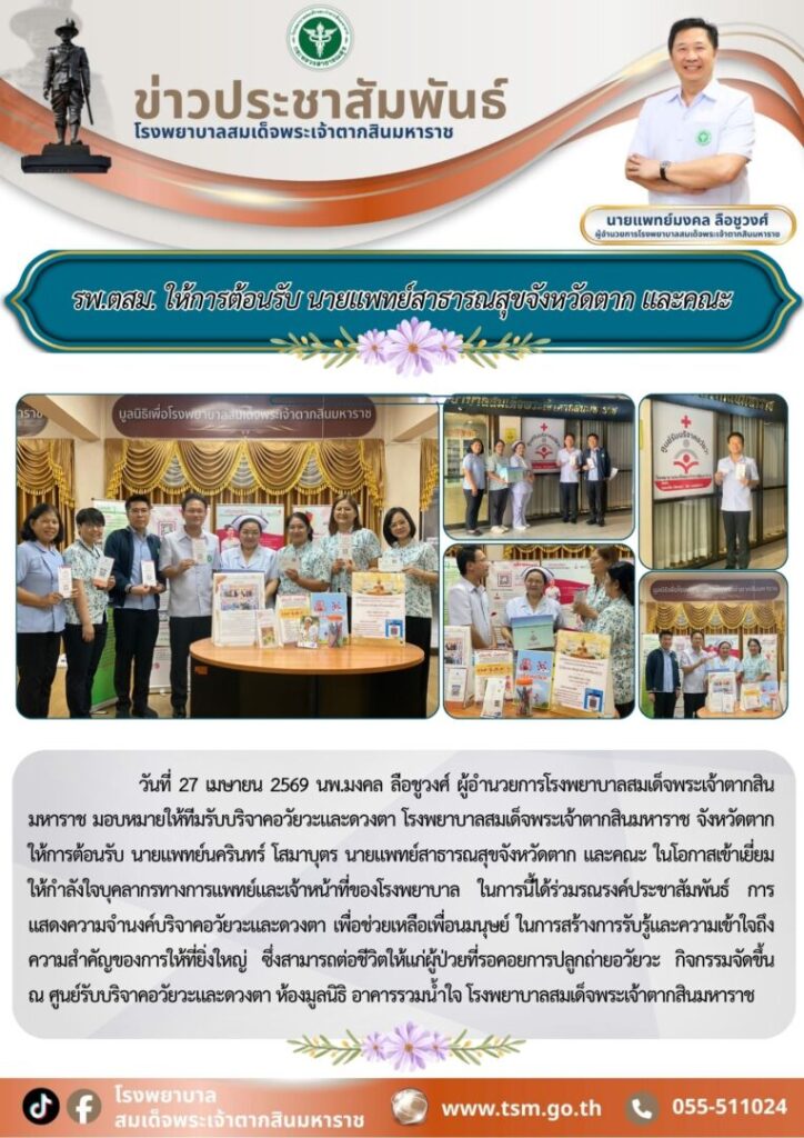 วันที่ 27 เมษายน 2569 นพ.มงคล ลือชูวงศ์ ผู้อำนวยการโรงพยาบาลสมเด็จพระเจ้าตากสินมหาราช มอบหมายให้ทีมรับบริจาคอวัยวะและดวงตา โรงพยาบาลสมเด็จพระเจ้าตากสินมหาราช จังหวัดตาก ให้การต้อนรับ นายแพทย์นครินทร์ โสมาบุตร นายแพทย์สาธารณสุขจังหวัดตาก และคณะ ในโอกาสเข้าเยี่ยมให้กำลังใจบุคลากรทางการแพทย์และเจ้าหน้าที่ของโรงพยาบาล ในการนี้ได้ร่วมรณรงค์ประชาสัมพันธ์ การแสดงความจำนงค์บริจาคอวัยวะและดวงตา เพื่อช่วยเหลือเพื่อนมนุษย์ ในการสร้างการรับรู้และความเข้าใจถึงความสำคัญของการให้ที่ยิ่งใหญ่ ซึ่งสามารถต่อชีวิตให้แก่ผู้ป่วยที่รอคอยการปลูกถ่ายอวัยวะ กิจกรรมจัดขึ้น ณ ศูนย์รับบริจาคอวัยวะและดวงตา ห้องมูลนิธิ อาคารรวมน้ำใจ โรงพยาบาลสมเด็จพระเจ้าตากสินมหาราช