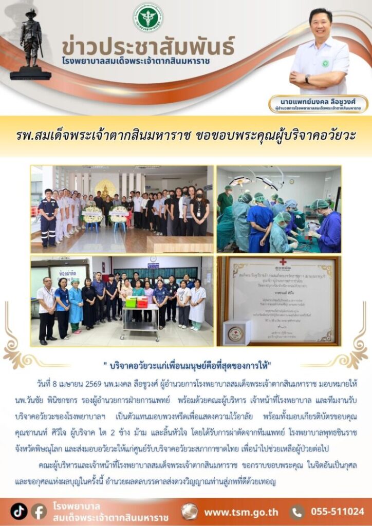 วันที่ 8 เมษายน 2569 นพ.มงคล ลือชูวงศ์ ผู้อำนวยการโรงพยาบาลสมเด็จพระเจ้าตากสินมหาราช มอบหมายให้ นพ.วันชัย พินิชกชกร รองผู้อำนวยการฝ่ายการแพทย์ พร้อมด้วยคณะผู้บริหาร เจ้าหน้าที่โรงพยาบาล และทีมงานรับบริจาคอวัยวะของโรงพยาบาลฯ เป็นตัวแทนมอบพวงหรีดเพื่อแสดงความไว้อาลัย พร้อมทั้งมอบเกียรติบัตรขอบคุณ คุณชานนท์ ศิวิใจ ผู้บริจาค ไต 2 ข้าง ม้าม และลิ้นหัวใจ โดยได้รับการผ่าตัดจากทีมแพทย์ โรงพยาบาลพุทธชินราช จังหวัดพิษณุโลก และส่งมอบอวัยวะให้แก่ศูนย์รับบริจาคอวัยวะสภากาชาดไทย เพื่อนำไปช่วยเหลือผู้ป่วยต่อไป