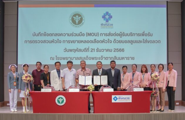 วันที่ 21 ธันวาคม 2566 นพ.บรรเจิด นนทสูติ ผู้อำนวยการโรงพยาบาลสมเด็จพระเจ้าตากสินมหาราช พร้อมด้วยเจ้าหน้าที่โรงพยาบาล ร่วมต้อนรับนพ.สมคิด อุดมกิจมงคล ผู้อำนวยการโรงพยาบาลพิษณุเวช คณะผู้บริหาร และเจ้าหน้าที่โรงพยาบาลพิษณุเวช จังหวัดพิษณุโลก จัดพิธีลงนามบันทึกข้อตกลงความร่วมมือ (MOU) การส่งต่อผู้รับบริการเพื่อรับการตรวจสวนหัวใจ การขยายหลอดเลือดหัวใจ ด้วยบอลลูนและใส่ขดลวด ทั้งนี้โรงพยาบาลพิษณุเวชมอบเงินบริจาค…