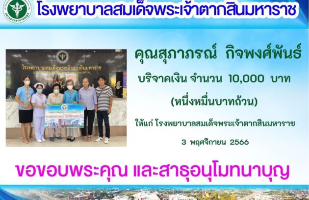 ” บริจาคอวัยวะแก่เพื่อนมนุษย์คือที่สุดของการให้ “ วันที่ 12 พฤศจิกายน 2566 นพ.บรรเจิด นนทสูติ ผู้อำนวยการโรงพยาบาลสมเด็จพระเจ้าตากสินมหาราช มอบหมายให้ นางนิตยา สุวรรณาภรณ์ รองผู้อำนวยการฝ่ายการพยาบาล พร้อมด้วยนางสุพัตรา แจ่มตระกูล รองผู้อำนวยการฝ่ายบริหาร เป็นตัวแทนร่วมทำบุญมอบพวงหรีด จากโรงพยาบาลสมเด็จพระเจ้าตากสินมหาราช ศูนย์ดวงตา…