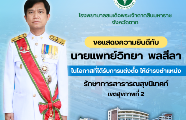 วันที่ 13 ตุลาคม 2566 นพ.บรรเจิด นนทสูติ ผู้อำนวยการโรงพยาบาลสมเด็จพระเจ้าตากสินมหาราชมอบหมายให้นายแพทย์วันชัย พินิชกชกร รองผู้อำนวยการฝ่ายการแพทย์ นางนิตยา สุวรรณาภรณ์ รองผู้อำนวยการฝ่ายการพยาบาล นางสุพัตรา แจ่มตระกูล รองผู้อำนวยการฝ่ายบริหาร และเจ้าหน้าที่โรงพยาบาล ร่วมต้อนรับ นายสมชัย กิจเจริญรุ่งโรจน์ ผู้ว่าราชการจังหวัดตาก…