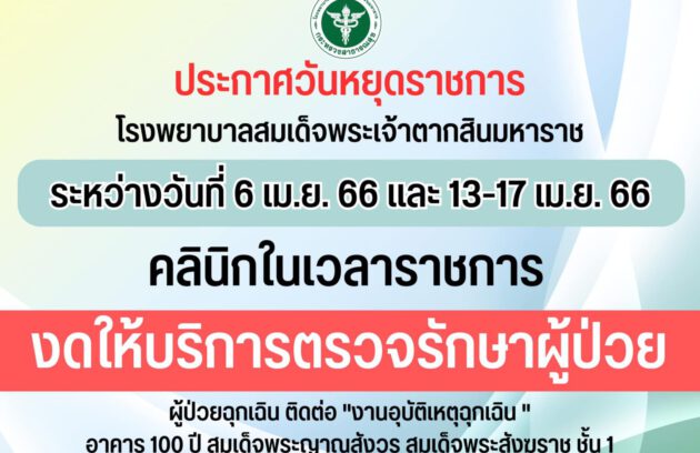 ประกาศวันหยุดราชการ ระหว่างวันที่ 6 เม.ย. 66 และ 13-17 เม.ย. 66 คลินิกในเวลาราชการ งดให้บริการตรวจรักษาผู้ป่วย ผู้ป่วยฉุกเฉิน ติดต่อ “งานอุบัติเหตุฉุกเฉิน” อาคาร 100 ปี