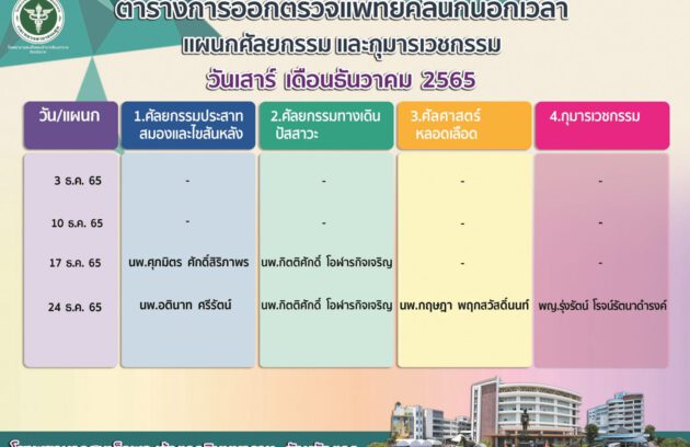 คลินิกพิเศษนอกเวลาราชการ วันเสาร์ เดือนธันวาคม 2565 วันเสาร์ ที่ 3 และ 10 ธันวาคม ปิดให้บริการ