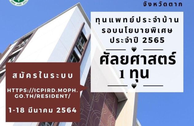 ขอเชิญชวนแพทย์ทุกท่าน สมัครทุนแพทย์ประจำบ้าน รอบนโยบายพิเศษ ประจำปี 2565 สาขาศัลยศาสตร์ จำนวน 1 ทุน สมัครในระบบ https://icpird.moph.go.th/resident/ ตั้งแต่วันที่ 1 – 18 มีนาคม 2564 ติดต่อสอบถามข้อมูลเพิ่มเติมได้ที่ งานพัฒนาทรัพยากรบุคคล (คุณกาญจนา…