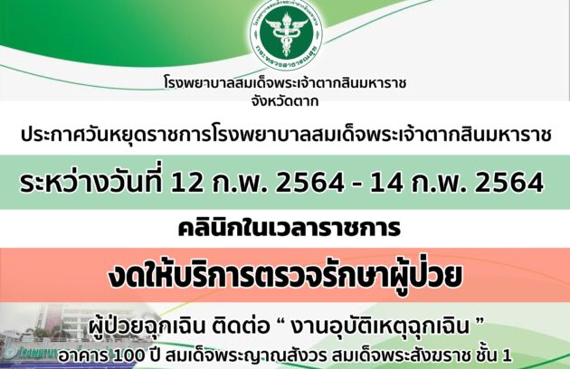โรงพยาบาลสมเด็จพระเจ้าตากสินมหาราช ประกาศวันหยุดราชการ ในระหว่างวันที่ 12-14 กุมภาพันธ์ 2564 คลินิกในเวลาราชการ งดให้บริการตรวจรักษาผู้ป่วย หากเจ็บป่วยฉุกเฉิน ติดต่อ งานอุบัติเหตุฉุกเฉิน ณ ชั้น 1 อาคาร 100 ปี สมเด็จพระญานสังวร สมเด็จพระสังฆราชฯ ได้ตลอด…