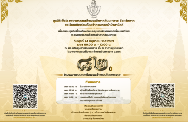 ขอเชิญร่วมเป็นเจ้าภาพทอดผ้าป่าสามัคคี เนื่องในโอกาสครบรอบ 82 ปี โรงพยาบาลสมเด็จพระเจ้าตากสินมหาราช เพื่อสมทบทุนจัดซื้อเครื่องมือ และอุปกรณ์ทางการแพทย์ เพื่อมอบให้แก่ โรงพยาบาลสมเด็จพระเจ้าตากสินมหาราช สอบถามรายละเอียดเพิ่มเติม นางสาวปรารถนา กาญจนจตุรงค์ (หมี้แสน) โทร 081-0378298 , 062-3109350