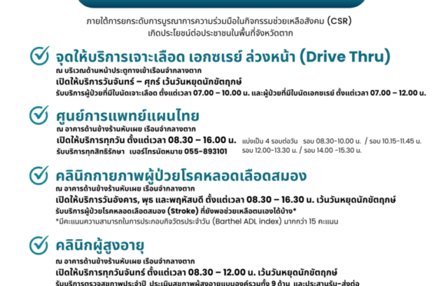 โรงพยาบาลสมเด็จพระเจ้าตากสินมหาราช ร่วมกับ เรือนจำกลางตาก เปิดให้บริการสาธารณสุขสำหรับประชาชนทั่วไป ณ เรือนจำกลางตาก จุดให้บริการเจาะเลือด เอกซเรย์ล่วงหน้า (Drive Thru) ศูนย์การแพทย์แผนไทย คลินิกกายภาพผู้ป่วยโรคหลอดเลือดสมอง คลินิกผู้สูงอายุ ติดต่อสอบถามเพิ่มเติมได้ที่เบอร์ 055-511-024 (รพ.ตสม) , 055-893098 (เรือนจำกลางตาก) ,…