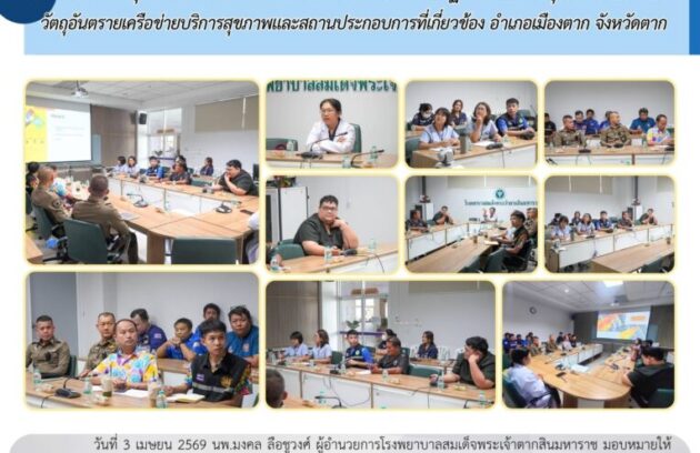 วันที่ 3 เมษยน 2569 นพ.มงคล ลือชูวงศ์ ผู้อำนวยการโรงพยาบาลสมเด็จพระเจ้าตากสินมหาราช มอบหมายให้ พญ.รุ่งนภา ศิริพรไพบูลย์ รองผู้อำนวยการฝ่ายบริการปฐมภูมิ พร้อมด้วยกลุ่มงานอาชีวเวชกรรม และกลุ่มงานอุบัติเหตุ และฉุกเฉิน จัดประชุมหารือเพื่อเตรียมความพร้อมโครงการอบรมเชิงปฏิบัติการรองรับอุบัติภัยจากสารเคมี วัตถุอันตรายเครือข่ายบริการสุขภาพฯ กรณีอุบัติเหตุกลุ่มชน และสารแอมโมเนียรั่วไหล โดยมีหน่วยงานที่เข้าร่วมประชุมได้แก่ สถานีตำรวจภูธรเมืองตาก…