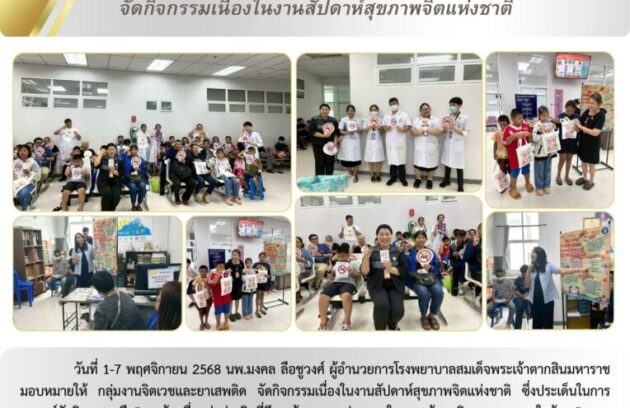 วันที่ 1-7 พฤศจิกายน 2568 นพ.มงคล ลือชูวงศ์ ผู้อำนวยการโรงพยาบาลสมเด็จพระเจ้าตากสินมหาราช มอบหมายให้ กลุ่มงานจิตเวชและยาเสพติด จัดกิจกรรมเนื่องในงานสัปดาห์สุขภาพจิตแห่งชาติ ซึ่งประเด็นในการรณรงค์จัดกิจกรรม คือ”รอบรู้…เพื่ออยู่อย่างจิตที่ดี สะท้อนความมุ่งหมายในการสร้างเสริมสุขภาวะทางใจด้วย “ความรู้รอบด้าน”โดยกรอบแนวคิดดังกล่าวถูกพัฒนาเป็น “4 มิติ แห่งความรู้” หรือ 4 รู้…