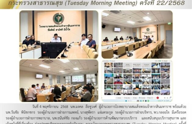 วันที่ 4 พฤศจิกายน 2568 นพ.มงคล ลือชูวงศ์ ผู้อำนวยการโรงพยาบาลสมเด็จพระเจ้าตากสินมหาราช พร้อมด้วย นพ.วันชัย พินิชกชกร รองผู้อำนวยการฝ่ายการแพทย์, นางสุพัตรา แจ่มตระกูล รองผู้อำนวยการฝ่ายบริหาร, พว.กลอยใจ มีเครือรอด รองผู้อำนวยการฝ่ายการพยาบาล, นพ.ธนันท์ชัย กองแก้ว รองผู้อำนวยการด้านพัฒนาระบบบริการ…