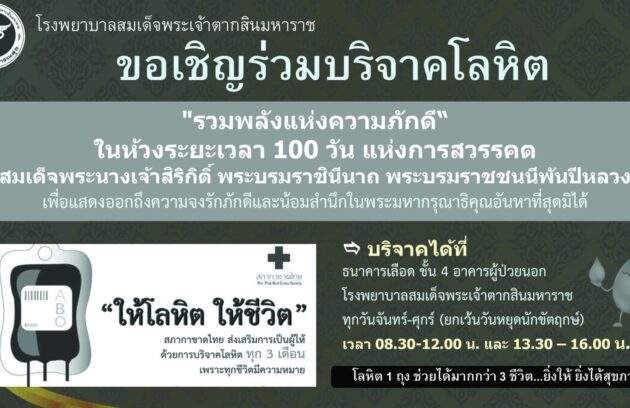 โรงพยาบาลสมเด็จพระเจ้าตากสินมหาราช ขอเชิญชวนผู้มีจิตศรัทธา บริจาคโลหิต บริจาคดวงตา และอวัยวะ รวมพลังแห่งความภักดี รวมพลังแห่งความภักดีในห้วงระยะเวลา 100 วันแห่งการสวรรคต สมเด็จพระนางเจ้าสิริกิติ์ พระบรมราชินีนาถ พระบรมราชชนนีพันปีหลวงเพื่อแสดงออกถึงความจงรักภักดีและน้อมสำนึกในพระมหากรุณาที่คุณอันหาที่สุดไม่ได้