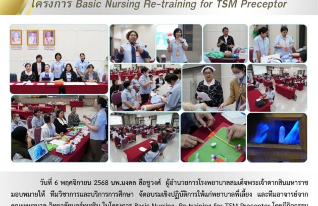 วันที่ 6 พฤศจิกายน 2568 นพ.มงคล ลือชูวงศ์ ผู้อำนวยการโรงพยาบาลสมเด็จพระเจ้าตากสินมหาราช มอบหมายให้ ทีมวิชาการและบริการการศึกษา จัดอบรมเชิงปฏิบัติการให้แก่พยาบาลพี่เลี้ยง และทีมอาจารย์จากคณะพยาบาล วิทยาลัยนอร์ทเทริน ในโครงการ Basic Nursing Re-training for TSM Preceptor โดยมีกิจกรรมเสริมความรู้เรื่อง…