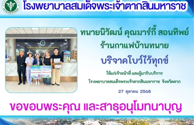 วันที่ 31 ตุลาคม 2568 นพ.มงคล ลือชูวงศ์ ผู้อำนวยการโรงพยาบาลสมเด็จพระเจ้าตากสินมหาราช จังหวัดตาก พร้อมด้วยคณะผู้บริหาร และเจ้าหน้าที่โรงพยาบาล ร่วมรับมอบเงินบริจาค จำนวน 18,500 บาท (หนึ่งหมื่นแปดพันห้าร้อยบาทถ้วน) จากครอบครัวพุ่มพันธ์ และครอบครัวคุณอุดร ตันติสุนทร เพือสนับสนุนการดำเนินงานด้านการแพทย์และสาธารณสุขของโรงพยาบาลสมเด็จพระเจ้าตากสินมหาราช โรงพยาบาลสมเด็จพระเจ้าตากสินมหาราช…