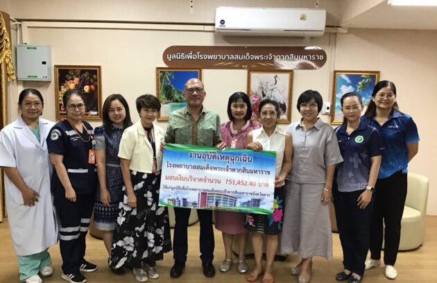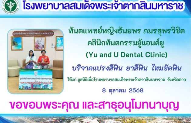 วันที่ 15 ตุลาคม 2568 นายแพทย์บรรเจิด นนทสูติ ผู้อำนวยการโรงพยาบาลสมเด็จพระเจ้าตากสินมหาราช พร้อมด้วยคณะกรรมการมูลนิธิเพื่อโรงพยาบาลสมเด็จพระเจ้าตากสินมหาราช รับมอบเงินบริจาคจำนวน 751,452.40 บาท (เจ็ดแสนห้าหมื่นหนึ่งพันสี่ร้อยห้าสิบสองบาทสี่สิบสตางค์) จากกลุ่มงานอุบัติเหตุและฉุกเฉิน โรงพยาบาลสมเด็จพระเจ้าตากสินมหาราช เพื่อจัดซื้อกล้องส่องช่วยใส่ท่อช่วยหายใจพร้อมบันทึกภาพระบบวิดิทัศน์ 2 เครื่อง จำนวนเงิน 240,000 บาท…