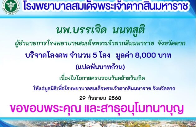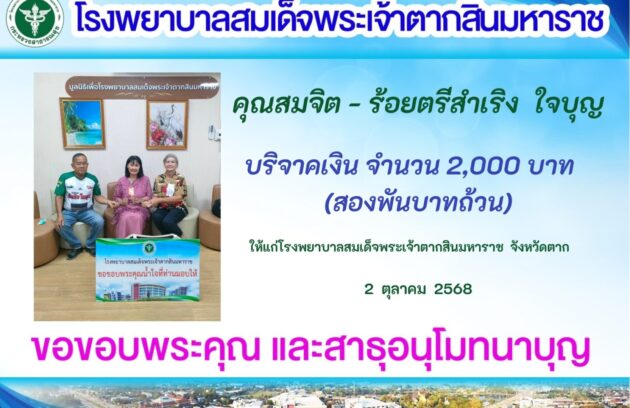 วันที่ 26 กันยายน 2568 นพ.บรรเจิด นนทสูติ ผู้อำนวยการโรงพยาบาลสมเด็จพระเจ้าตากสินมหาราช มอบหมายให้ พว.นิตยา สุวรรณาภรณ์ รองผู้อำนวยการฝ่ายการพยาบาล พร้อมด้วยนางสุพัตรา แจ่มตระกูล รองผู้อำนวยการฝ่ายบริหาร และเจ้าหน้าที่โรงพยาบาล เป็นผู้แทนรับมอบเงินจำนวน 100,000 บาท (หนึ่งแสนบาทถ้วน) โดยมี…