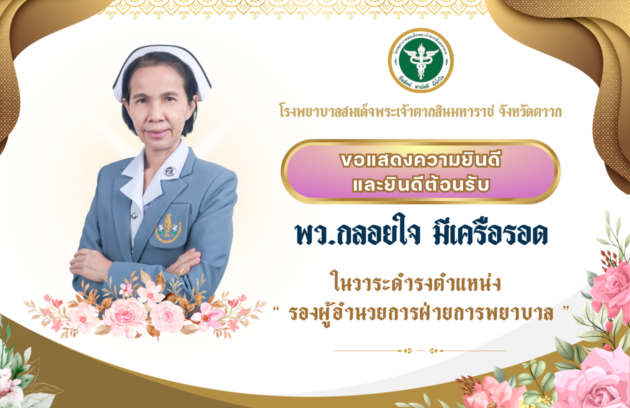 ขอแสดงความยินดีและต้อนรับ พว.กลอยใจ มีเครือรอด ในโอกาสดำรงตำแหน่ง รักษาการรองผู้อำนวยการฝ่ายการพยาบาล โรงพยาบาลขออวยพรให้ประสบความสำเร็จในการปฏิบัติหน้าที่ เป็นผู้นำที่เข้มแข็ง และเป็นกำลังสำคัญในการพัฒนางานบริการด้านการพยาบาล เพื่อสร้างสุขภาพที่ดีและความอบอุ่นให้กับประชาชนชาวจังหวัดตากต่อไป