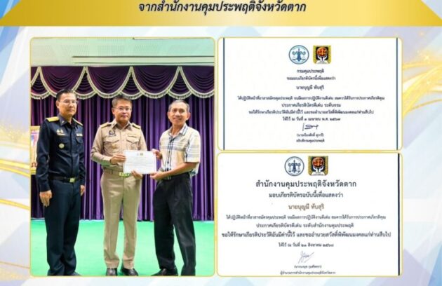 วันที่ 3 ตุลาคม 2568 นายบุญมี ทับสุริ นักสังคมสงเคราะห์ชำนาญการ โรงพยาบาลสมเด็จพระเจ้าตากสินมหาราช ในโอกาสเข้ารับมอบเกียรติบัตรปฏิบัติหน้าที่อาสาสมัครคุมประพฤติ จากสำนักงานคุมประพฤติจังหวัดตาก ในการปฏิบัติหน้าที่อาสาสมัครคุมประพฤติด้วยความมุ่งมั่นและเสียสละ จนมีผลงานเป็นที่ประจักษ์ และได้รับการยกย่องให้เป็นผู้มีผลการปฏิบัติงานดีเด่น สมควรได้รับการประกาศเกียรติคุณเกียรติบัตรดีเด่น ระดับกรม ณ ห้องประชุมอำเภอเมืองตาก จังหวัดตาก โรงพยาบาลสมเด็จพระเจ้าตากสินมหาราช ขอแสดงความยินดีและชื่นชมในความมุ่งมั่นตั้งใจของนายบุญมี…