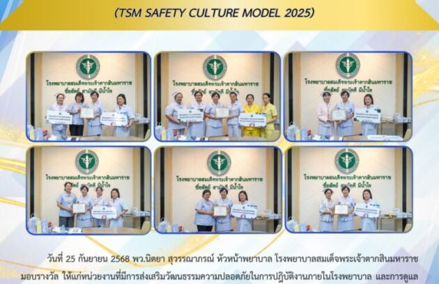 วันที่ 25 กันยายน 2568 พว.นิตยา สุวรรณาภรณ์ หัวหน้าพยาบาล โรงพยาบาลสมเด็จพระเจ้าตากสินมหาราช มอบรางวัล ให้แก่หน่วยงานที่มีการส่งเสริมวัฒนธรรมความปลอดภัยในการปฎิบัติงานภายในโรงพยาบาล และการดูแลผู้ป่วยอย่างมีคุณภาพ (TSM safety culture model 2025) หน่วยงานที่รายงานอุบัติการณ์ความเสี่ยงสูงสุด ดังนี้ 1.หอผู้ป่วยกุมารเวชกรรม 2.หอผู้ป่วย…