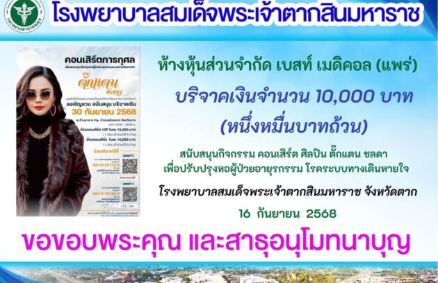 วันที่ 18 กันยายน 2568 นพ.บรรเจิด นนทสูติ ผู้อำนวยการโรงพยาบาลสมเด็จพระเจ้าตากสินมหาราช มอบหมายให้ พว.นิตยา สุวรรณาภรณ์ รองผู้อำนวยการฝ่ายการพยาบาล พร้อมด้วยนางสุพัตรา แจ่มตระกูล รองผู้อำนวยการฝ่ายบริหาร และเจ้าหน้าที่โรงพยาบาล รับมอบเครื่องตรวจคลื่นไฟฟ้าหัวใจ (Electrocardiograph) มูลค่า 150,000 บาท…