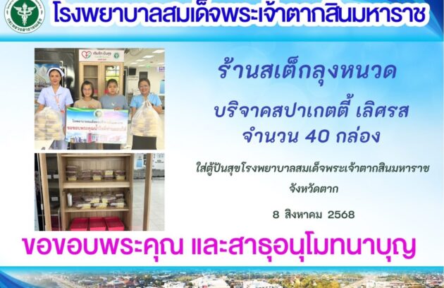 วันที่ 14 สิงหาคม พ.ศ. 2568 (วันที่ 7 ) นพ.บรรเจิด นนทสูติ ผู้อำนวยการโรงพยาบาลสมเด็จพระเจ้าตากสินมหาราช มอบหมายให้นางสาวชลาลัย เขียวสุวรรณ ที่ปรึกษาของโรงพยาบาลด้านการแพทย์และสาธารณสุข พร้อมด้วยเจ้าหน้าที่ โรงพยาบาล โดยมีพว.สุนิสา ใจสุภาพ และพว.สุนิสา จินดา…