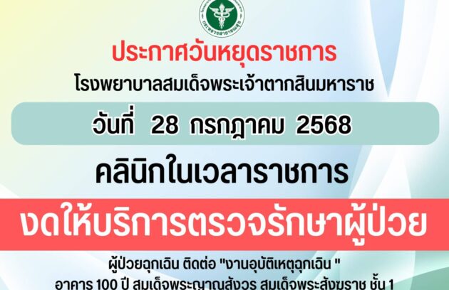งดให้บริการตรวจผู้ป่วย วันที่ 28 กรกฎาคม 2568 ผู้ป่วยฉุกเฉิน ติดต่องานอุบัติเหตุฉุกเฉิน อาคาร 100 ปี ชั้น 1