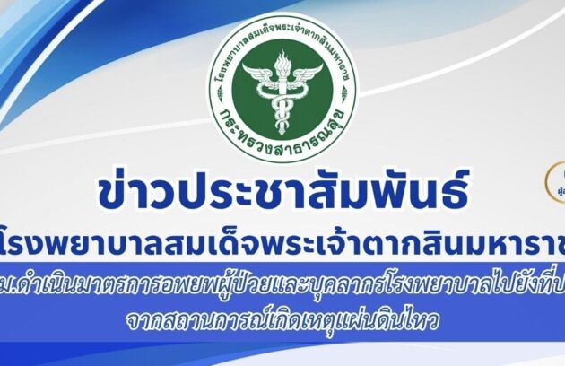 วันที่ 28 มีนาคม 2568 เวลา 13.20 น. เกิดเหตุแผ่นดินไหวจุดศูนย์กลางอยู่บริเวณประเทศ เมียนมาร์ ส่งผลให้เจ้าหน้าที่โรงพยาบาลสมเด็จพระเจ้าตากสินมหาราช ดำเนินมาตรการอพยพผู้ป่วยและบุคลากรโรงพยาบาลไปยังที่ปลอดภัยภายใต้การนำของท่านผู้อำนายการโรงพยาบาล นพ.บรรเจิด นนทสูติ และทีมผู้บริหารโรงพยาบาลสมเด็จพระเจ้าตากสินมหาราช ทั้งนี้จึงขอขอบคุณเจ้าที่ทุกฝ่ายที่ปฏิบัติงานอย่างรวดเร็วเป็นไปอย่างเรียบร้อยและปลอดภัย รวมถึงขอบพระคุณความร่วมมือจากผู้ป่วยและผู้รับบริการทุกท่าน จนสถานการณ์กลับเข้าสู่ภาวะปกติ ไม่มีรายงานผู้ได้รับบาดเจ็บและความเสียหายร้ายแรง
