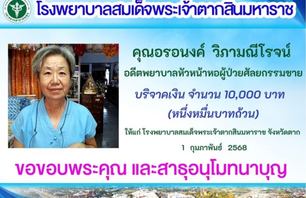 วันที่ 20 กุมภาพันธ์ 2568 โรงพยาบาลสมเด็จพระเจ้าตากสินมหาราช รับมอบผักปลอดสารพิษ ในกิจกรรมปลูกผักแบ่งปัน จวนผู้ว่าราชการจังหวัดตาก ภายใต้แนวคิด “ปลูก ปรุง ปัน จวนนี้มีรัก ปลูกผักแบ่งปัน” โดยนายชูชีพ พงษ์ไชย ผู้ว่าราชการจังหวัดตาก มอบหมายให้ นางนิตยา ดีสุวรรณ์…