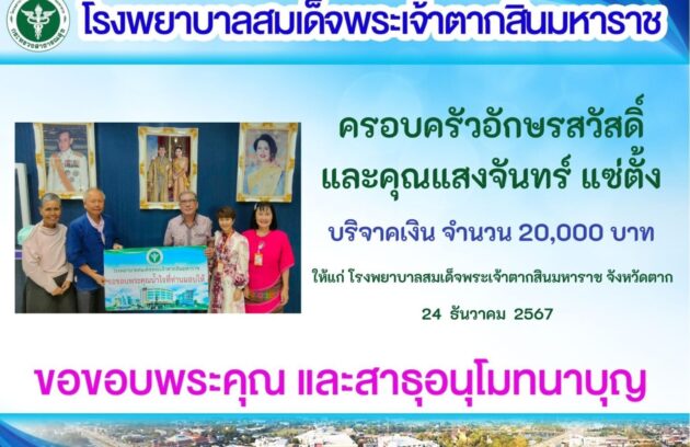 วันที่ 28 ธันวาคม 2567 นพ.บรรเจิด นนทสูติ ผู้อำนวยการโรงพยาบาลสมเด็จพระเจ้าตากสินมหาราช มอบหมายให้นางสุพัตรา แจ่มตระกูล รองผู้อำนวยการฝ่ายบริหาร และเจ้าหน้าที่โรงพยาบาล ร่วมเปิดงานตากสินมหาราชานุสรณ์ จังหวัดตาก ประจำปี 2567 – 2568 เพื่อเทิดพระเกียรติสมเด็จพระเจ้าตากสินมหาราช และอนุรักษ์สืบสานศิลปวัฒนธรรม จารีตประเพณีท้องถิ่น…