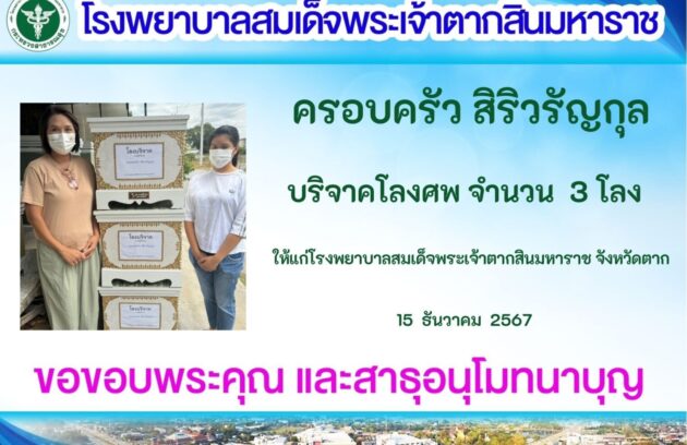 24 ธันวาคม 2567 ครอบครัวอักษรสวัสดิ์ และคุณแสงจันทร์ แซ่ตั้ง บริจาคเงิน จำนวน 20,000 บาท ให้แก่ โรงพยาบาลสมเด็จพระเจ้าตากสินมหาราช จังหวัดตาก