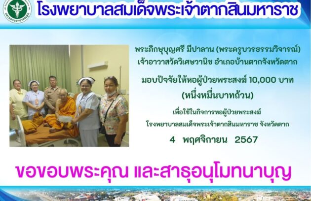 วันที่ 15 พฤศจิกายน 2567 นพ.บรรเจิด นนทสูติ ผู้อำนวยการโรงพยาบาลสมเด็จพระเจ้าตากสินมหาราช มอบหมายนพ.วันชัย พินิชกชกร รองผู้อำนวยการฝ่ายการแพทย์ พร้อมด้วย พว.นิตยา สุวรรณาภรณ์ รองผู้อำนวยการฝ่ายการพยาบาล นางสุพัตรา แจ่มตระกูล รองผู้อำนวยการฝ่ายบริหาร คณะผู้บริหาร และเจ้าหน้าที่โรงพยาบาล ร่วมพิธีถวายผ้าพระกฐินพระราชทานประจำปี…