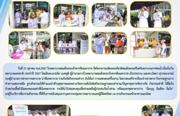 วันที่ 21 ตุลาคม พ.ศ.2567 โรงพยาบาลสมเด็จพระเจ้าตากสินมหาราช จัดโครงการเฉลิมพระเกียรติสมเด็จพระศรีนครินทราบรมราชชนนี เนื่องในวันพยาบาลแห่งชาติ ประจำปี 2567 โดยมีนพ.บรรเจิด นนทสูติ ผู้อำนวยการโรงพยาบาลสมเด็จพระเจ้าตากสินมหาราช เป็นประธาน และพว.นิตยา สุวรรณาภรณ์รองผู้อำนวยการฝ่ายการพยาบาล นำทีมพยาบาล ร่วมกันจัดกิจกรรมต่างๆ อันได้แก่ การแสดงดนตรีในสวน โดยวงดนตรีจากเรือนจำกลางตาก…