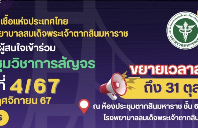 ขอเรียนเชิญผู้สนใจเข้าร่วมการประชุมวิชาการสัญจร ครั้งที่ 4/67 โดยสมาคมโรคติดเชื้อแห่งประเทศไทยร่วมกับโรงพยาบาลสมเด็จพระเจ้าตากสินมหาราช ในวันที่ 15 พฤศจิกายน 2567 ฟรี ! ค่าลงทะเบียน ณ ห้องประชุมตากสินมหาราช ชั้น 6 อาคารผู้ป่วยนอก สนใจสมัครได้ตั้งแต่วันนี้ – 31 ตุลาคม…