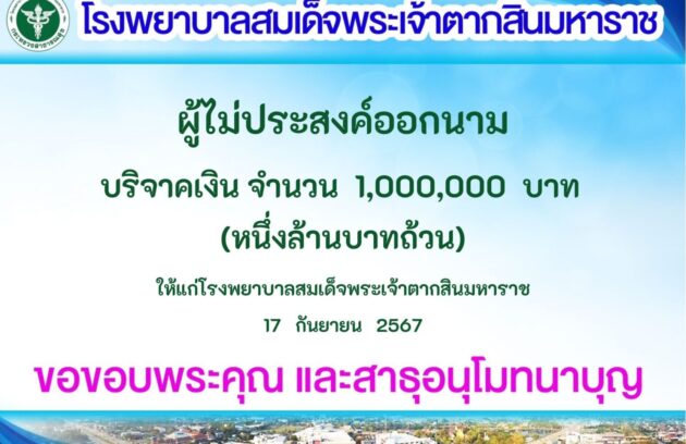 วันที่ 17 กันยายน 2567 นพ.บรรเจิด นนทสูติ ผู้อำนวยการโรงพยาบาลสมเด็จพระเจ้าตากสินมหาราช มอบหมายให้ พว.นิตยา สุววรณาภรณ์ รองผู้อำนวยการฝ่ายการพยาบาล ร่วมให้กำลังใจและส่งทีมแพทย์-พยาบาล ชุด Sky Doctor ของโรงพยาบาลสมเด็จพระเจ้าตากสินมหาราช นำโดย พญ.ศิวนาฏ พีระเชื้อ (แพทย์เวชศาสตร์ฉุกเฉิน),…