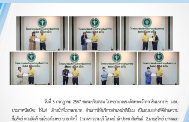 วันที่ 3 กรกฎาคม 2567 ชมรมจริยธรรม โรงพยาบาลสมเด็จพระเจ้าตากสินมหาราช มอบประกาศนียบัตร ให้แก่ เจ้าหน้าที่โรงพยาบาล ด้านการให้บริการด่านหน้าดีเยีี่ยม เป็นแบบอย่างที่ดีด้านความซื่อสัตย์ ตามอัตลักษณ์ของโรงพยาบาล ดังนี้ 1.นางสาวจามจุรี ใสวงษ์ นักประชาสัมพันธ์ 2.นายสุวิทย์ ยาหมอก พนักงานจ้างเหมาบริการศูนย์เปล 3.นางสาวปาณิสรา…
