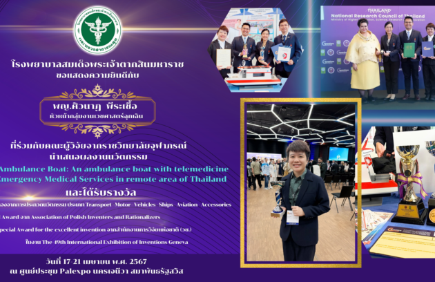 โรงพยาบาลสมเด็จพระเจ้าตากสินมหาราชขอแสดงความยินดีกับแพทย์หญิงศิวนาฏ พีระเชื้อ หัวหน้ากลุ่มงานเวชศาสตร์ฉุกเฉิน ที่ร่วมกับคณะผู้วิจัยจากราชวิทยาลัยจุฬาภรณ์ นำเสนอผลงานนวัตกรรมCRA Ambulance Boat: An ambulance boat with telemedicine for Emergency Medical Services in remote area of…