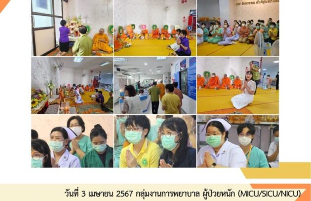 วันที่ 3 เมษายน 2567 กลุ่มงานการพยาบาล ผู้ป่วยหนัก (MICU/SICU/NICU) จัดพิธีทำบุญ ประจำปี 2567 โดยมี นางนิตยา สุวรรณาภรณ์ รองผู้อำนวยการฝ่ายการพยาบาล เป็นประธานฝ่ายฆราวาส มีพระอธิการมโน เจ้าอาวาสวัดมะเขือแจ้ อำเภอเมือง จังหวัดตาก เป็นประธานฝ่ายสงฆ์…