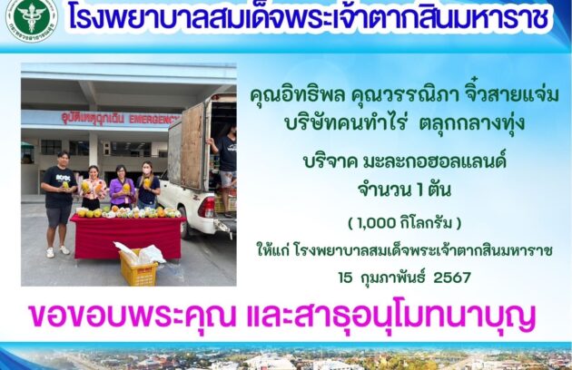 วันที่ 19 กุมภาพันธ์ 2567 นพ.บรรเจิด นนทสูติ ผู้อำนวยการโรงพยาบาลสมเด็จพระเจ้าตากสินมหาราช มอบหมายให้กลุ่มภารกิจอำนวยการโรงพยาบาล ร่วมกิจกรรมถวายความจงรักภักดีแด่สมเด็จพระกนิษฐาธิราชเจ้า กรมสมเด็จพระเทพรัตนราชสุดาฯ สยามบรมราชกุมารี ด้วยการยืนแปลอักษรเป็นข้อความว่า “ตาก รัก สธ.” และพร้อมใจสวมเสื้อสีม่วง เพื่อถวายพระพรและถวายกำลังใจแด่พระองค์ท่าน โดยมีนายสมชัย กิจเจริญรุ่งโรจน์ ผู้ว่าราชการจังหวัดตาก…