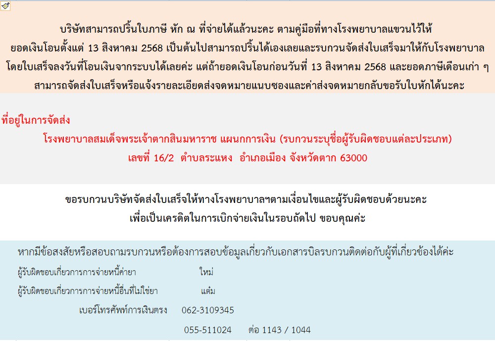 วิธีการปริ้นหลักฐานรับรองการหักภาษี ณ ที่จ่าย 1 file(s) 4.22 MB Download เจ้าหนี้ค่ายาและเจ้าหนี้อื่น นอกเหนือจากค่ายา ระบบจ่ายตรง (GF) เงินเข้าเดือน สิงหาคม 2568 (15-18 ก.ย.68) 1 file(s) 581 KB Download ระบบจ่ายตรง (GF) เงินเข้าแล้ว ในเดือน กันยายน 2568 รอบที่ 1 1 file(s) 330.53 KB Download ระบบจ่ายตรง (GF) เงินเข้าแล้ว ในเดือน กันยายน 2568 รอบที่ 2 1 file(s) 330.53 KB Download เจ้าหนี้ค่ายาและเจ้าหนี้อื่นๆ นอกเหนือจากค่ายา ระบบจ่ายตรง (GF) เบิกจ่ายแล้วประจำเดือน ตุลาคม 2568 1 file(s) 372.57 KB Download
