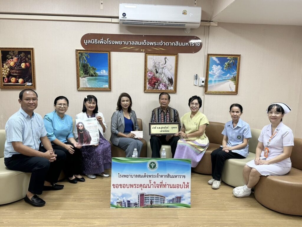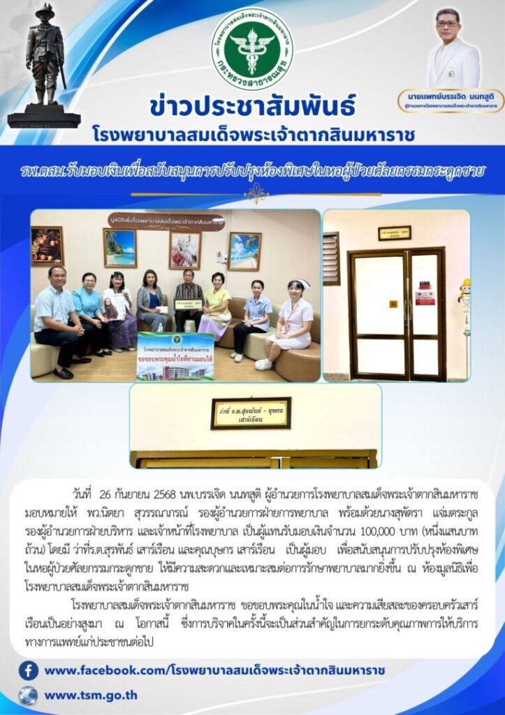 วันที่ 26 กันยายน 2568 นพ.บรรเจิด นนทสูติ ผู้อำนวยการโรงพยาบาลสมเด็จพระเจ้าตากสินมหาราช มอบหมายให้ พว.นิตยา สุวรรณาภรณ์ รองผู้อำนวยการฝ่ายการพยาบาล พร้อมด้วยนางสุพัตรา แจ่มตระกูล รองผู้อำนวยการฝ่ายบริหาร และเจ้าหน้าที่โรงพยาบาล เป็นผู้แทนรับมอบเงินจำนวน 100,000 บาท (หนึ่งแสนบาทถ้วน) โดยมี ว่าที่ร.ต.สุรพันธ์ เสาร์เรือน และคุณบุษกร เสาร์เรือน เป็นผู้มอบ เพื่อสนับสนุนการปรับปรุงห้องพิเศษในหอผู้ป่วยศัลยกรรมกระดูกชาย ให้มีความสะดวกและเหมาะสมต่อการรักษาพยาบาลมากยิ่งขึ้น ณ ห้องมูลนิธิเพื่อโรงพยาบาลสมเด็จพระเจ้าตากสินมหาราช