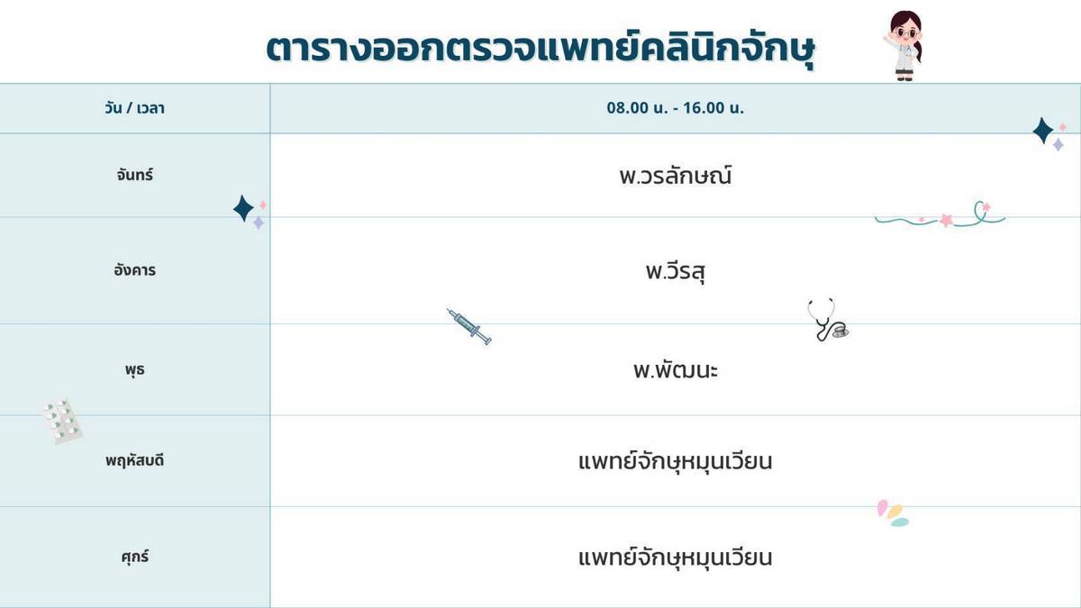 ดวงตา คือ อวัยวะหลักที่มีความสำคัญเป็นอย่างมาก ช่วยให้เรามองเห็นและดำเนินชีวิตประจำวันได้อย่างปกติ ดังนั้นเมื่อเกิดความผิดปกติย่อมส่งผลกระทบต่อทั้งร่างกายและจิตใจ เราจึงพร้อมให้บริการดูแลรักษาและให้คำปรึกษาโรคทางตาเช่น ต้อกระจก ต้อหิน และโรคตาทุกชนิด วัดสายตาประกอบแว่น โดยแพทย์เฉพาะทางผู้เชี่ยวชาญที่มากด้วยประสบการณ์ เพื่อแก้ปัญหาความผิดปกติและโรคต่างๆ ในแบบระยะสั้นและระยะยาวได้อย่างตรงจุด เพื่อให้กลับมาใช้ชีวิตได้อย่างมีคุณภาพและดียิ่งกว่าเดิม