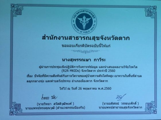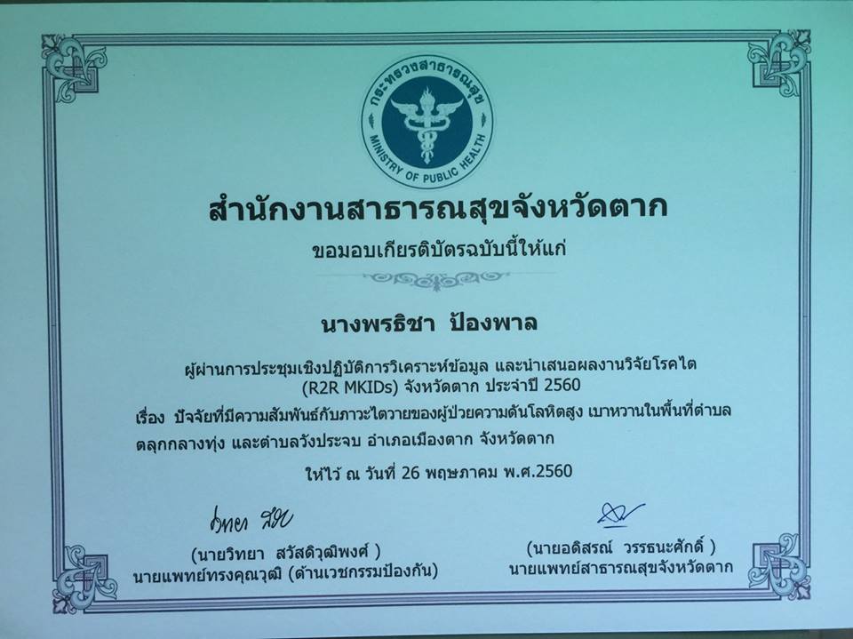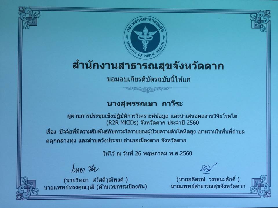 ขอแสดงความยินดีกับคุณสุพรรษา กาวีระ และคุณ พรธิชา ป้องพาลเป็นผู้ผ่านการประชุมเชิงปฎิบัติการวิเคราะห์ข้อมูลและนำเสนอผลงานวิจัยโรคไต((R2R MKIDs)จังหวัดตากประจำปี 2560 เรื่องปัจจัยที่มีความสัมพันธ์กับภาวะไตวายของผู้ป่วยความดันโลหิตสูงและเบาหวานในพื้นที่ตำบลตลุกกลางทุ่งและตำบลวังประจบอำเภอเมืองตาก จังหวัดตาก