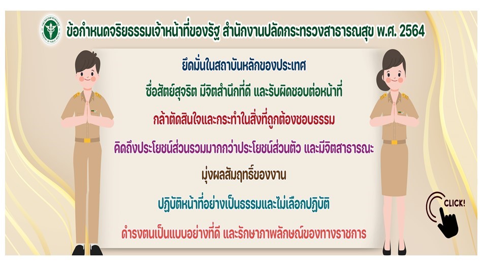 ข่าวโครงการ ข้อกำหนดจริยธรรมเจ้าหน้าที่ของรัฐ สำนักงานปลัดกระทรวงสาธารณสุข พ.ศ.2564 โดย สรรเพชร รัตนภักดิ์ดีกุล - 1 เมษายน 2021 0 896 แบ่งปันบนเฟสบุ๊ค ทวีตบนทวิตเตอร์ ข้อกำหนดจริยธรรมเจ้าหน้าที่ของรัฐสำนักงานปลัดกระทรวงสาธารณสุข พ.ศ. 2564